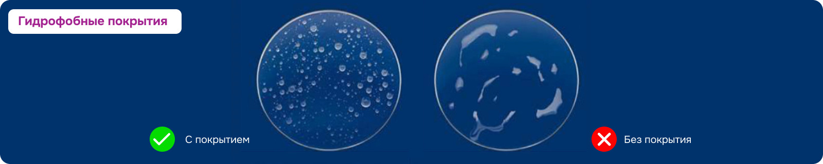 Такие покрытия делают линзы "боящимися воды и жира", что позволяет капелькам воды быстро скатываться с поверхности, вместо того чтобы оставаться на ней и создавать помехи для зрения. Также они отталкивают жирные и масляные вещества, такие как отпечатки пальцев и косметические средства, обеспечивая более чистую и более прозрачную поверхность линзы. Это особенно полезно в дождливую погоду или при занятии активными видами спорта.